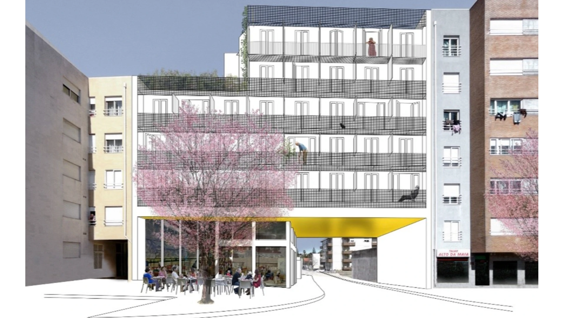 Este empreendimento integra habitação coletiva distribuída pelos seis pisos superiores, um espaço destinado a comércio e serviços e/ou equipamento complementar, bem como um logradouro com espaço verde de utilização comum pelos futuros moradores.